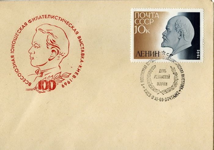 «1 ВСЕСОЮЗНАЯ ЮНОШЕСКАЯ ФИЛАТЕЛИСТИЧЕСКАЯ ВЫСТАВКА. ДЕНЬ ЛЕНИНСКОЙ МАРКИ» КИЕВ.ПОЧТАМТ 9 XI-69»