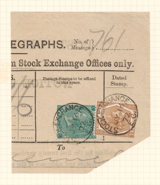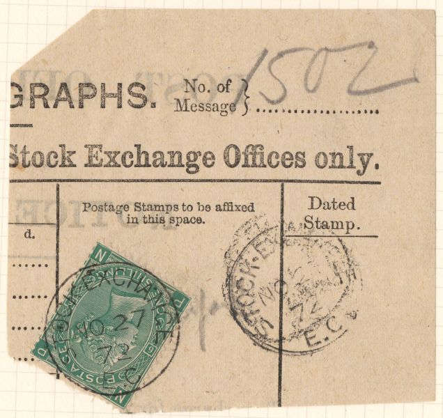 Известно, что по крайней мере в период с 1872 по 1873 год на исходящих телеграммах телеграфного отделения Лондонской фондовой биржи использовались поддельные марки достоинством в один шиллинг, именно столько составляла плата за отправку телеграммы из 20 слов.