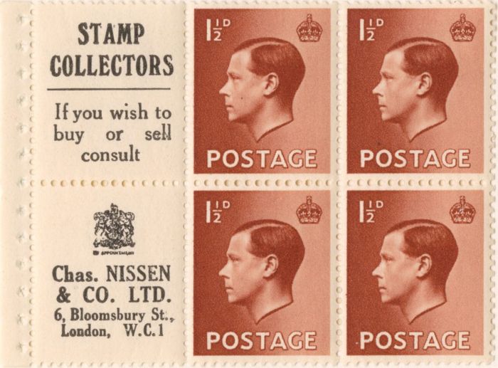 Буклет с марками короля Эдуарда VIII с рекламой Чарльза Ниссена, октябрь 1938 г.