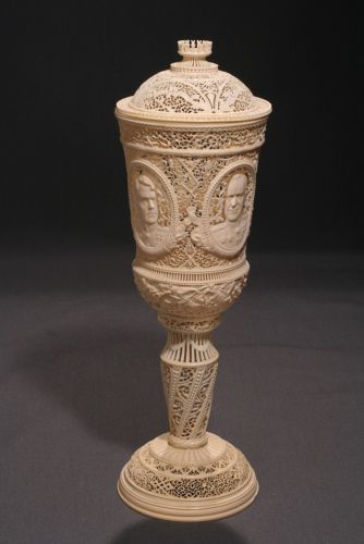 На поверхности кружки высотой всего 25 сантиметров, выполненной в 1774-1775 годах, холмогорский резчик Осип Христофорович Дудин смог поместить полсотни портретов правителей от Рюрика до Екатерины Великой. Один из профилей этого беспрецедентного изделия можно увидеть на многоцветной двусторонней репродукционной открытке издательства «Советский художник» 1981 года выпуска.