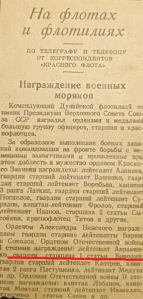 Заметка во фронтовой газете о награждении А. Бородина орденом Отечественной войны I степени. 1944 г.