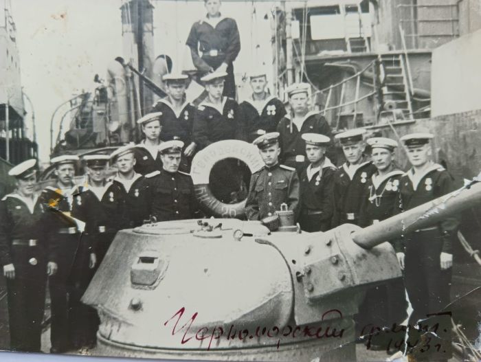 Экипаж бронекатера БК 53. 1943 год. А.В. Бородин в центре второго ряда