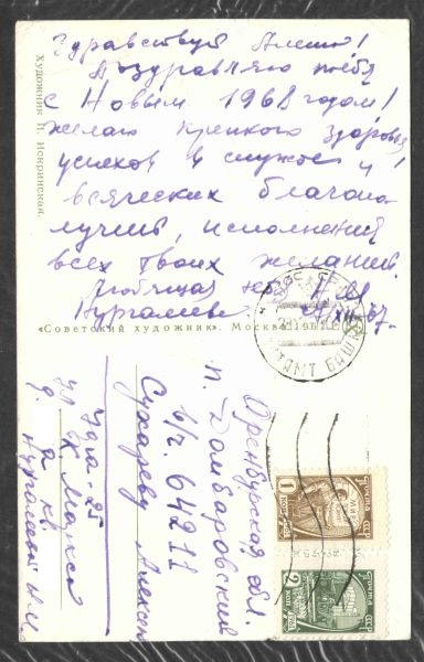 На обороте – искренние пожелания: «Здравствуй, Алёша! Поздравляю тебя с Новым, 1968 годом! Желаю крепкого здоровья, успехов в службе и всяческих благополучий, исполнения всех твоих желаний. Любящая тебя Н.М. Нургалеева. 27/XII-67)».