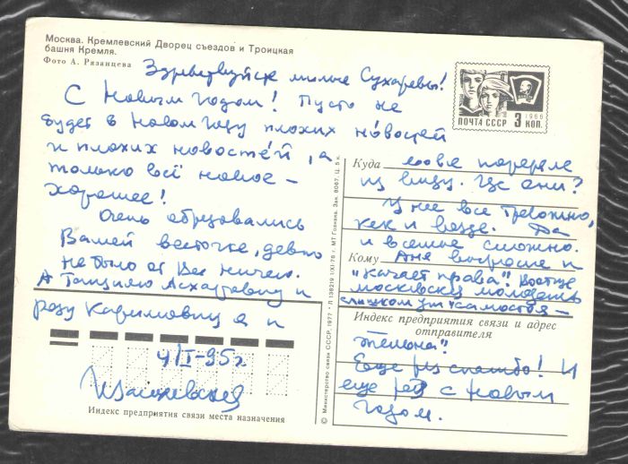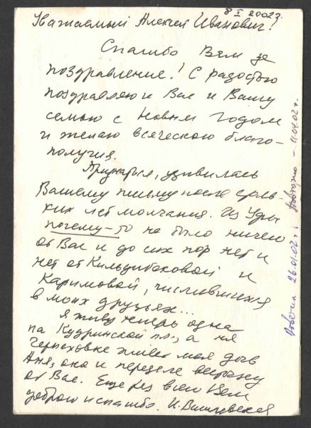 Из переписки кое-что сохранилось, в том числе и новогодние записки. Кстати, на одной из открыток Василевская нестандартно пожелала: «Пусть не будет в новом году плохих нОвостей и плохих новостЕй, а только всё новое – хорошее!»
