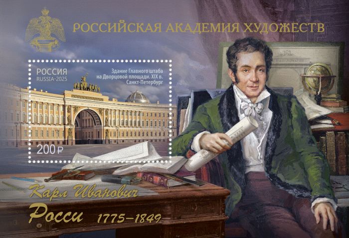 На марке изображено здание Главного штаба в Санкт-Петербурге, на полях блока — портрет архитектора К.И. Росси.