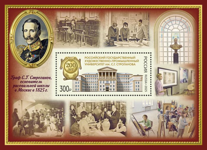 На почтовой марке изображено здание РГХПУ им. С.Г. Строганова; на полях блока — портрет графа С.Г. Строганова (Тамбовский областной краеведческий музей), фотографии, иллюстрирующие разные периоды становления университета.