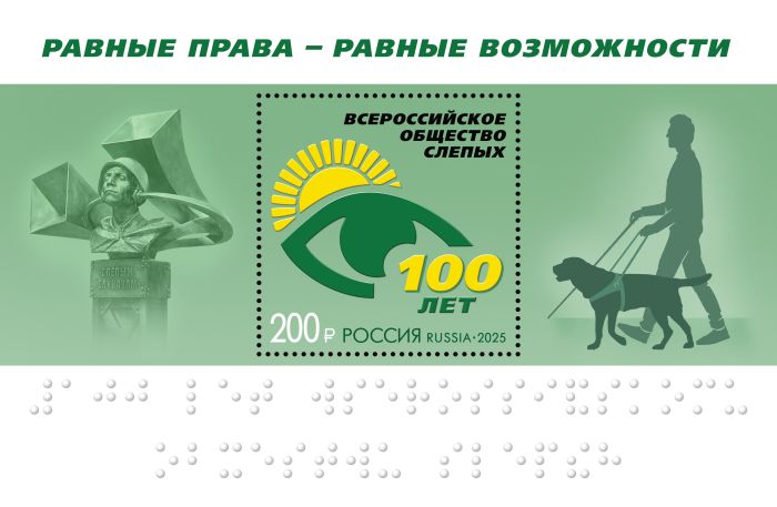 На почтовой марке изображён логотип празднования 100-летия ВОС, на полях блока размещены изображения памятника «Слепой слухач — защитник неба блокадного Ленинграда» скульптора М. Третьяковой, фигура незрячего с собакой-проводником, девиз общества «Равные права — равные возможности» и название темы, набранное шрифтом Брайля.
