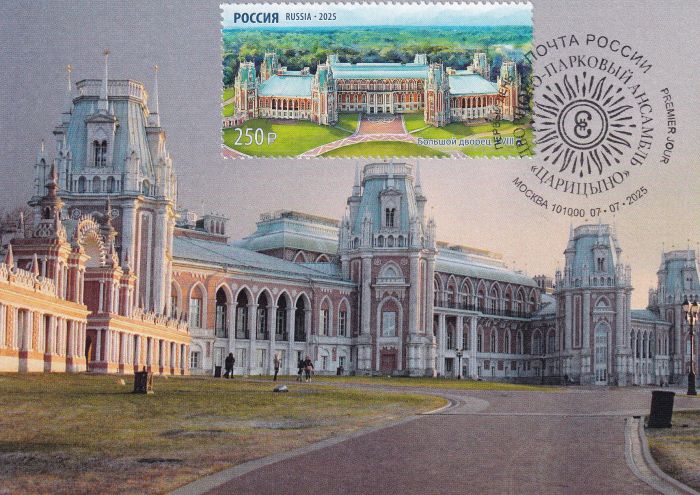На фото здание Большого дворца в утренние часы после дождя. И это счастливый случай, что на карточке нашлось место и для марки, и для гашения. В работе по подготовке блока и гашения активное участие принимали сотрудники и дизайнеры музея-заповедника «Царицыно».