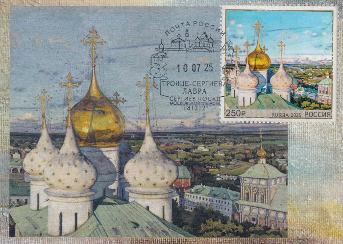 Безусловный лидер: картина художника К.К. Юона «Купола и ласточки». Марка полностью соответствует сюжету карточки — гашение с датой первого дня выпуска блока и местным гашением Троице-Сергиевой лавры.