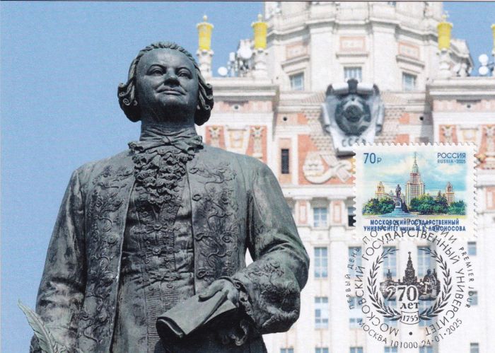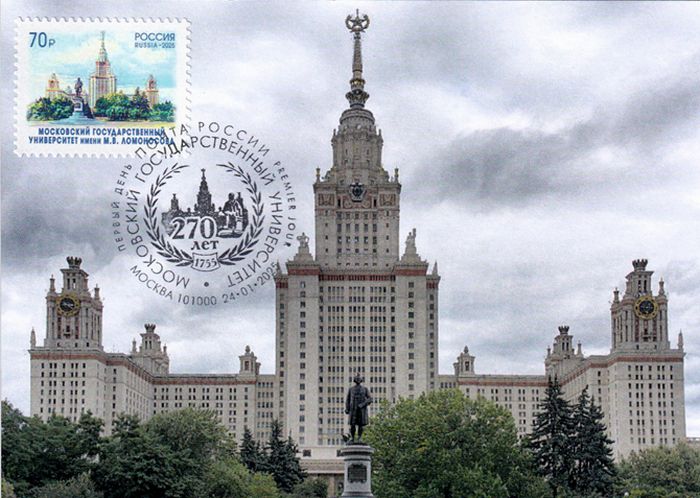 КМ к 270-летию Московского государственного университета. Полное совпадение: карточка, марка, рисунок, гашение, дата — ПД, место гашения — ПД. Предусмотрено место для марки и гашения, не влияющее на общий вид КМ.