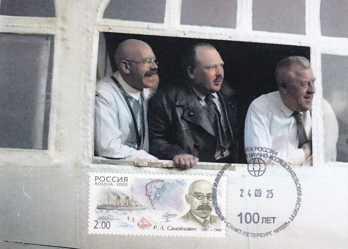 Переводное гашение Арктического и антарктического института РАН. На карточке — Р.Л. Самойлович и два начальника с советской и германской стороны, в окне дирижабля «Граф Цеппелин». Фото начала 30-х годов XX века (подверглось значительной обработке нейросетями). О дальнейшей трагической судьбе Самойловича и о совместной миссии дирижабля «Граф Цеппелин» по аэросъемке советского Севера можно прочитать в открытых источниках.