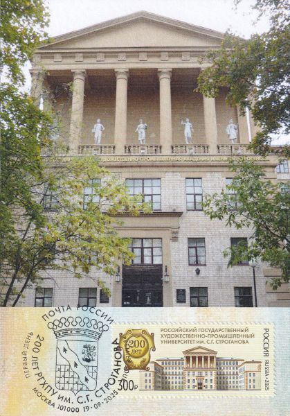КМ к 200-летию Строгановского университета РГХПУ им. С.Г. Строганова. Совпадение практически идеальное: на марке и карточке — здание «Строгановки»; гашение ПД; на штемпеле — логотип РГХПУ им. С.Г. Строганова. (Справка: род русских промышленников и помещиков, из которого происходили крупные землевладельцы, государственные деятели и меценаты XVI—XX веков. С XVIII века — бароны и графы Российской империи. Университет назван в честь государственного деятеля, коллекционера, генерала, графа Сергея Григорьевича Строганова (1794-1882).