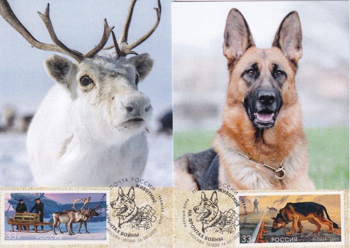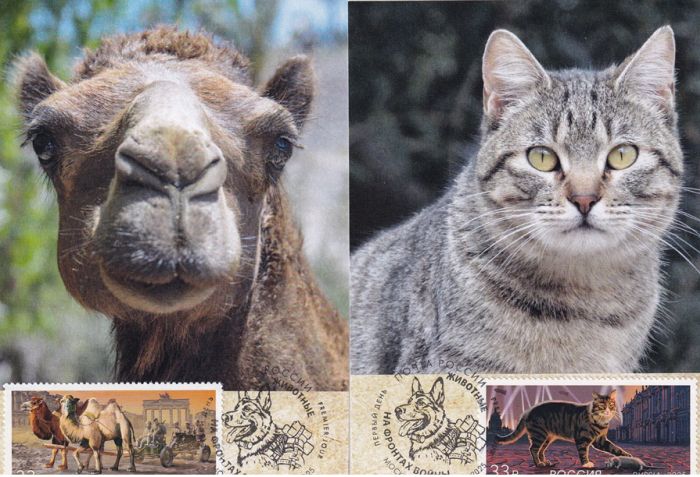 Четыре КМ к выпуску «Животные на войне». На марках и карточках — изображения соответствующих животных.