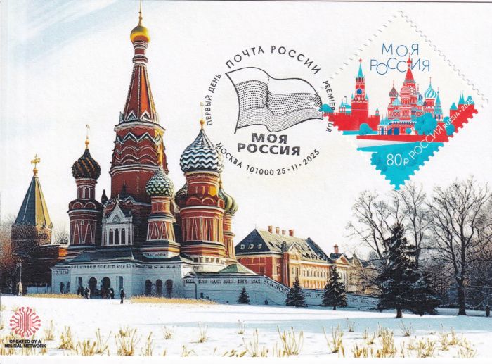 КМ к началу серии «Моя Россия». На марках изображены элементы Красной площади в Москве. Поэтому гашение в Москве — единственно верное. Гашения в других городах — сувенирные, поскольку там нет Красной площади как таковой. Выполнено нейросетью, предусмотрено место для марки и гашения.