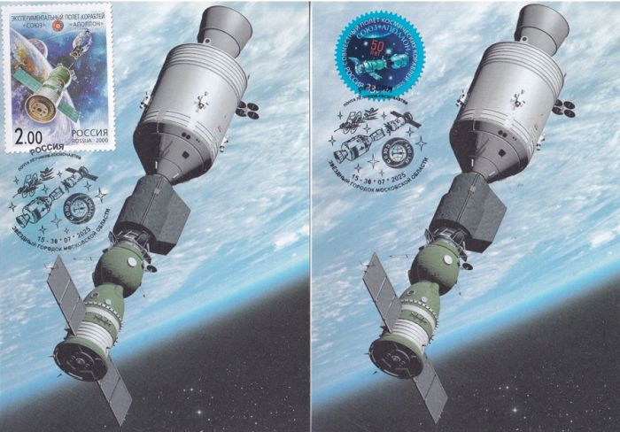 КМ к 50-летию полета «Союз» — «Аполлон». Гашение фиксированного дня 15-30 июля 2025 года; почта летчиков-космонавтов Звездного городка. Использовались марки 2000 и 2025 годов с изображением миссии. Было предусмотрено место для марки и гашения. Тираж — 2 экз. каждого КМ.