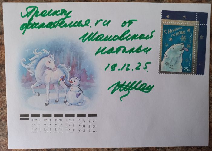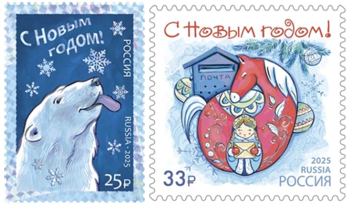 ♦АО «Марка» объявило конкурс на создание художественных марок 2025 года. Победителями стали работы: Ляшенко Анастасии — символ наступающего года, красная лошадь на фоне почтового ящика и новогоднего узора, матрёшка; и Шомовской Натальи — белый медведь со снежинкой.