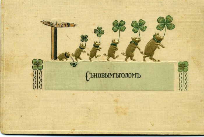 В русском почтовом обращении были карточки, напечатанные и за границей, и на родине. Среди них немного рисунков с изображением младенца Христа. Причем, нередко пейзаж вокруг пещеры далеко не библейский, а заснеженный европейский или даже русский (с избушками и православными церквями). Немало заимствованных европейских сюжетов. Встречаются символические пожелания счастья: изображения подковы, коня, клевера с четырьмя листочками, золотой свинки или копилки, набитого кошелька, свертков с подарками, трубочиста.