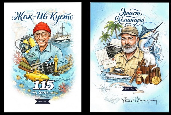 Почтовые карточки Проекта «POSTVENTURE & Почтовое приключение», посвящённые Ж.-И. Кусто и Э. Хемингуэю. 2025 г.