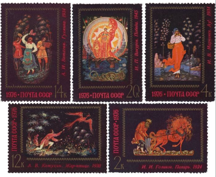 Искусство Палеха на почтовых марках 1976 года. Характеристика: офсет на мелованной бумаге с лаковым покрытием. Тираж 6,3;5,3;5,0;4,2;3,4.
