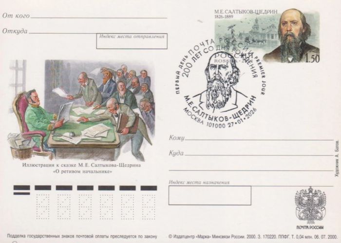 175-летие со дня рождения Салтыкова-Щедрина было отмечено выпуском почтовой карточки с оригинальной маркой.