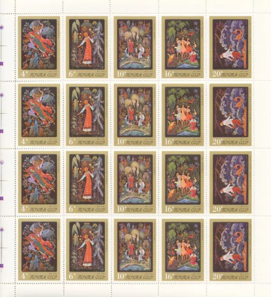 Искусство Палеха на почтовых марках 1975 года. Характеристика марок: офсет на мелованной бумаге с лаковым покрытием, сцепка из 5 марок. Тираж 1 млн.