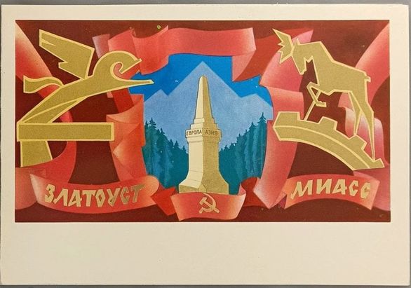 На этой же открытке изображена стела «Европа – Азия», расположенная на Транссибирской магистрали между Златоустом и Миассом, на ней более подробно остановлюсь чуть ниже.