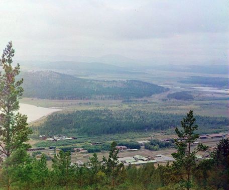 Внизу видно старое здание вокзала Миасс и Ильменское озеро (Ильмень). Снимок сделан с Ильменского хребта, являющегося частью группы Ильменских гор, представляющих собой группу хребтов, в пределах которых расположен Ильменский государственный заповедник.