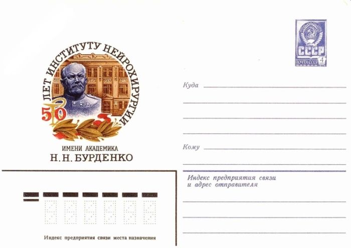 В 1981 году Министерство связи СССР выпустило художественный маркированный конверт «К 50-летию Института нейрохирургии им. академика Н.Н. Бурденко».